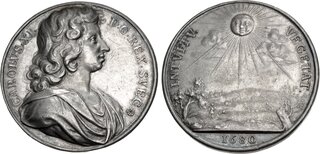 | Lot description: SWEDEN. Karl XI. 1660–1697. AR Medal (41mm, 29.71 g, 12h). Sweden's Honor Restored. By A. Karlsteen. Dated 1680. CAROLVS · XI · D · G · REX · SVEC (rosette), draped bust right / INTVITV · VEGETAT, radiant sun over landscape; 1680 in exergue. Delzanno p. 873. Iridescent toning, marks and hairlines, edge marks. Near EF. From the Drewry Family Collection. Ex Coin Galleries (37 February 1985), lot 1158. Estimate: 100 USD |