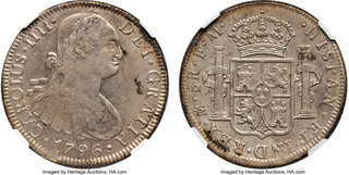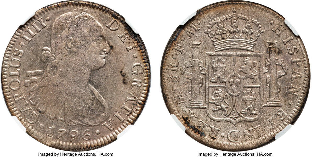 Charles IV "S.B. Pulaski" 8 Reales 1796 Mo-FM (Shipwreck Effect) NGC, Mexico City mint, KM109, Cal-959. Accompanied by box. Salvaged from the "S.B. Pulaski" (sunk in 1838 off North Carolina). A solid survivor from this early US shipwreck, this being the first silver coin from this wreck we offer, with the only handful that came to market bringing strong prices.