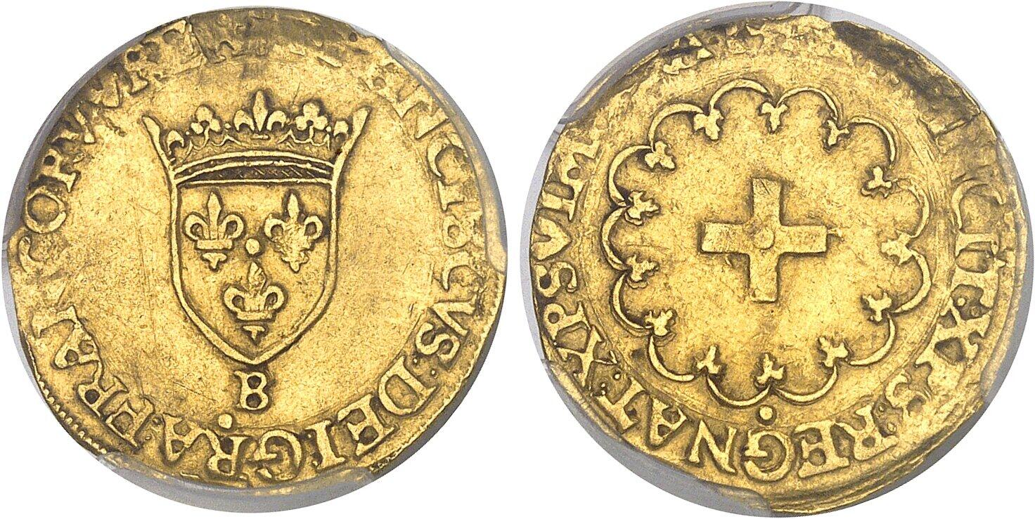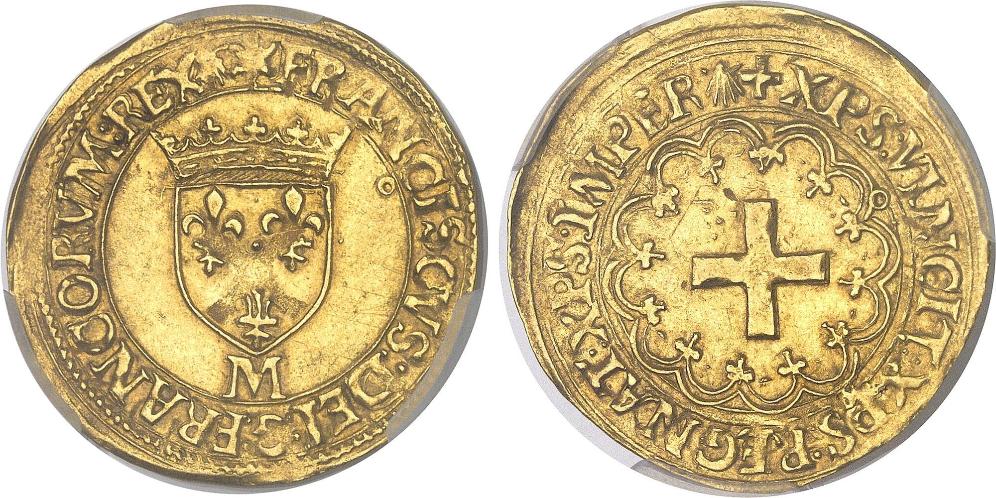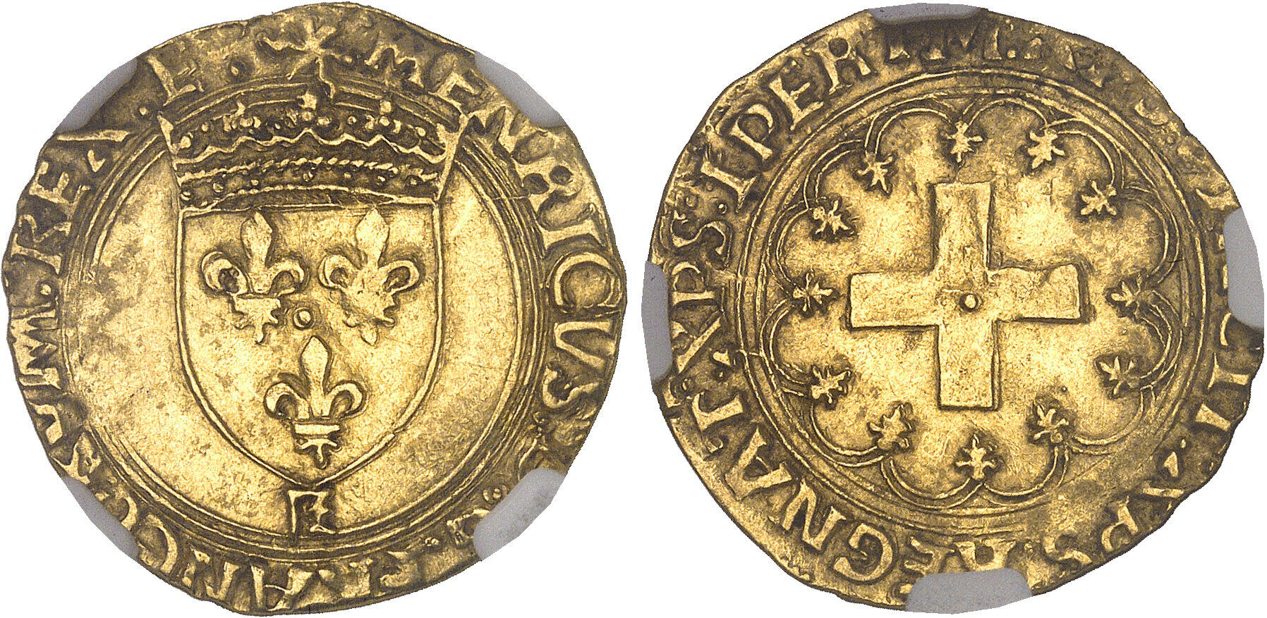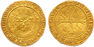 + LVDOVICVS : DEI : GRACIA : FRANCORVM : REX (ancre). Écu de France couronné soutenu par deux porcs-épics. R/. + XPS : VINCIT : XPC : REGNAT : XPC : IMPERAT (ancre). (ponctuation par des annelets à l'avers et au revers). Croix aux bras trifides cantonnée de deux L et de deux porcs-épics.