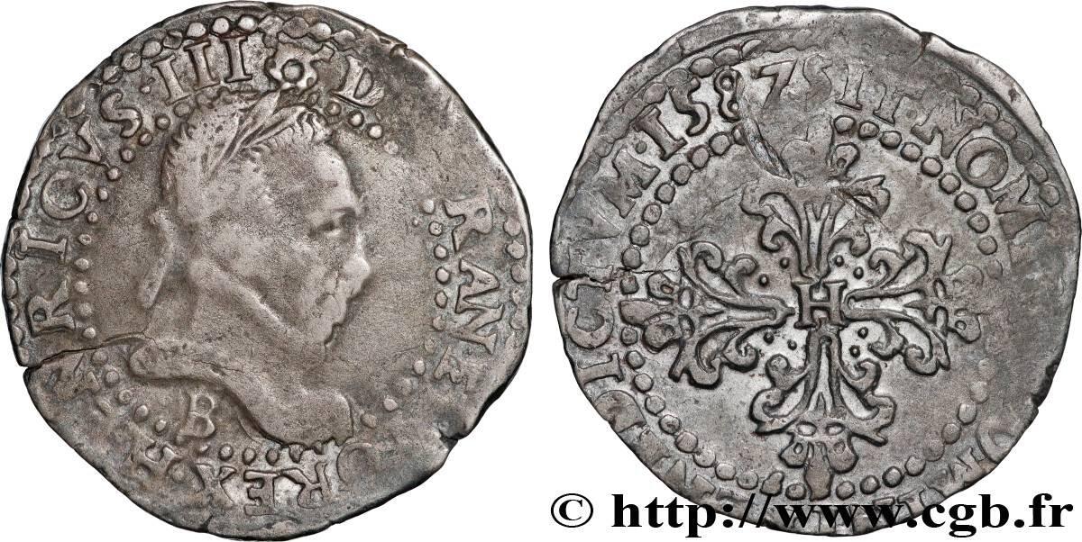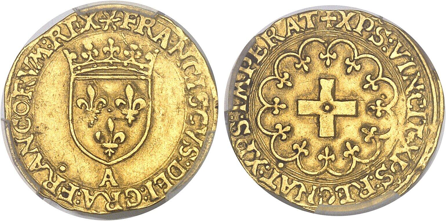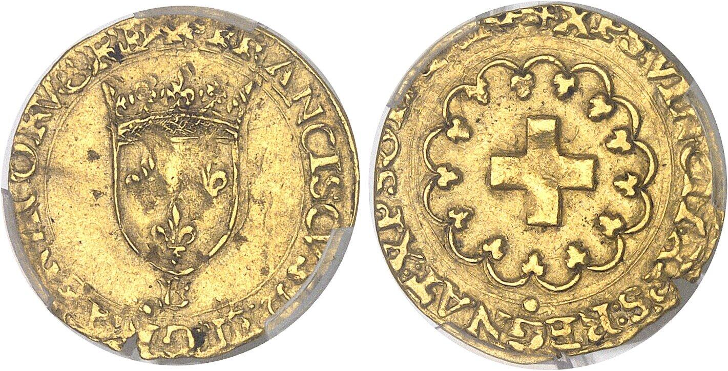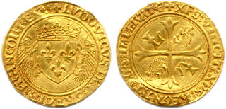+ LVDOVICVS : DEI : GRACIA : FRANCORVM : REX (ancre). Écu de France couronné soutenu par deux porcs-épics. R/. + XPS : VINCIT : XPC : REGNAT : XPC : IMPERAT (ancre). (ponctuation par des annelets à l'avers et au revers). Croix aux bras trifides cantonnée de deux L et de deux porcs-épics.