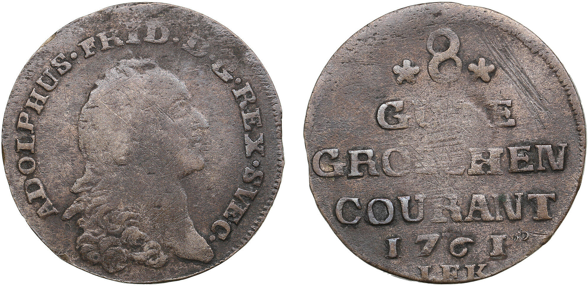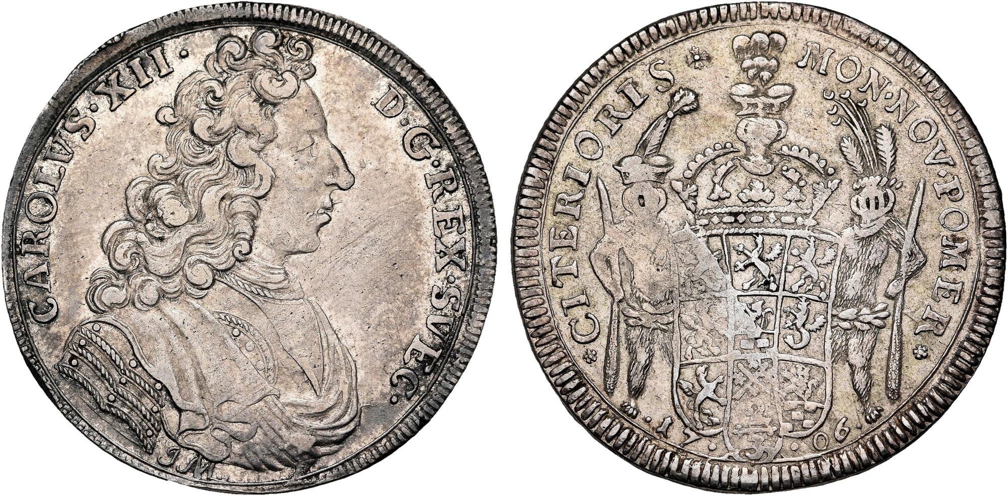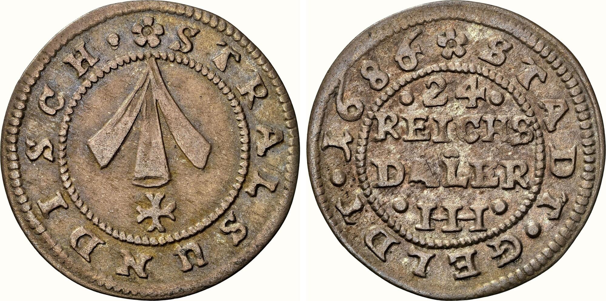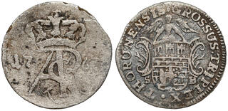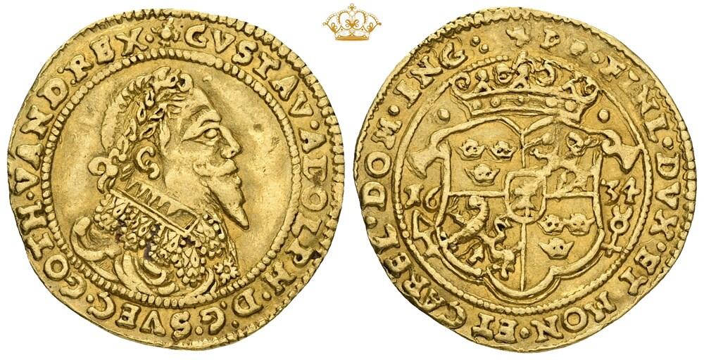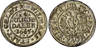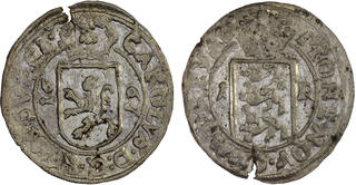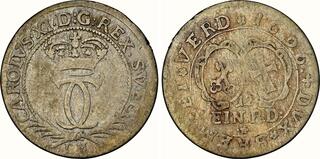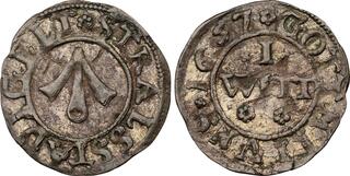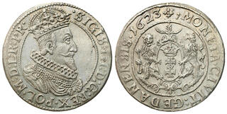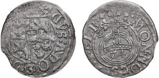 The Prussian city of Elbing (present day Poland) was under Swedish control 1626-1635 and again 1655-1660, and an extensive minting started in 1628. The City arms with the two crosses were intentionally made to resemble that of Danzig in order to facilitate the acceptance of the coinage in Poland.