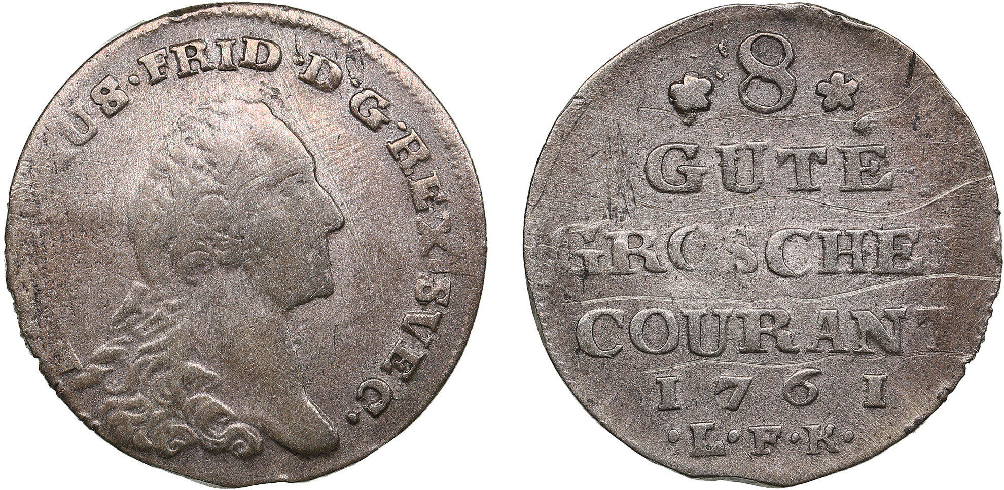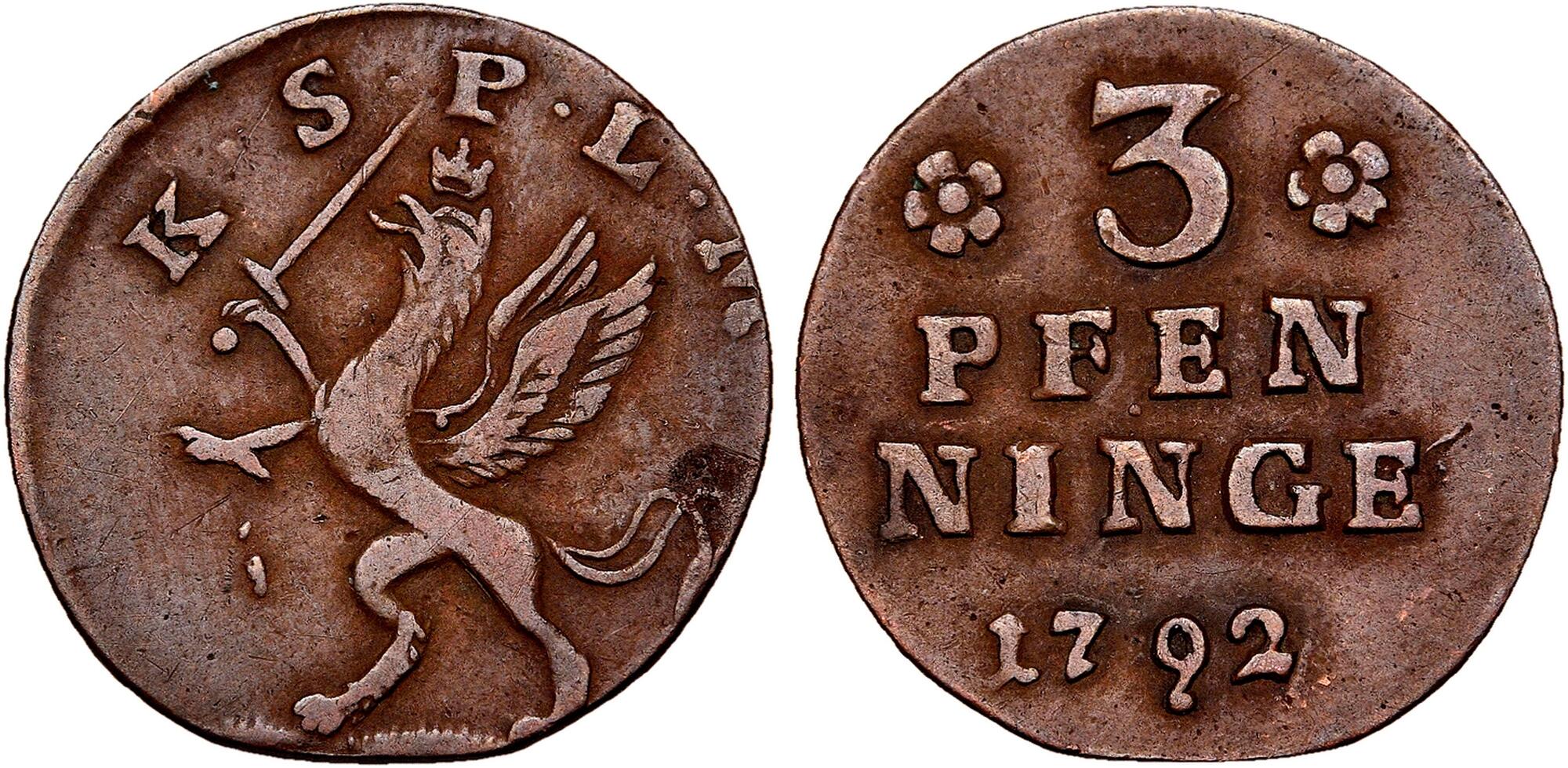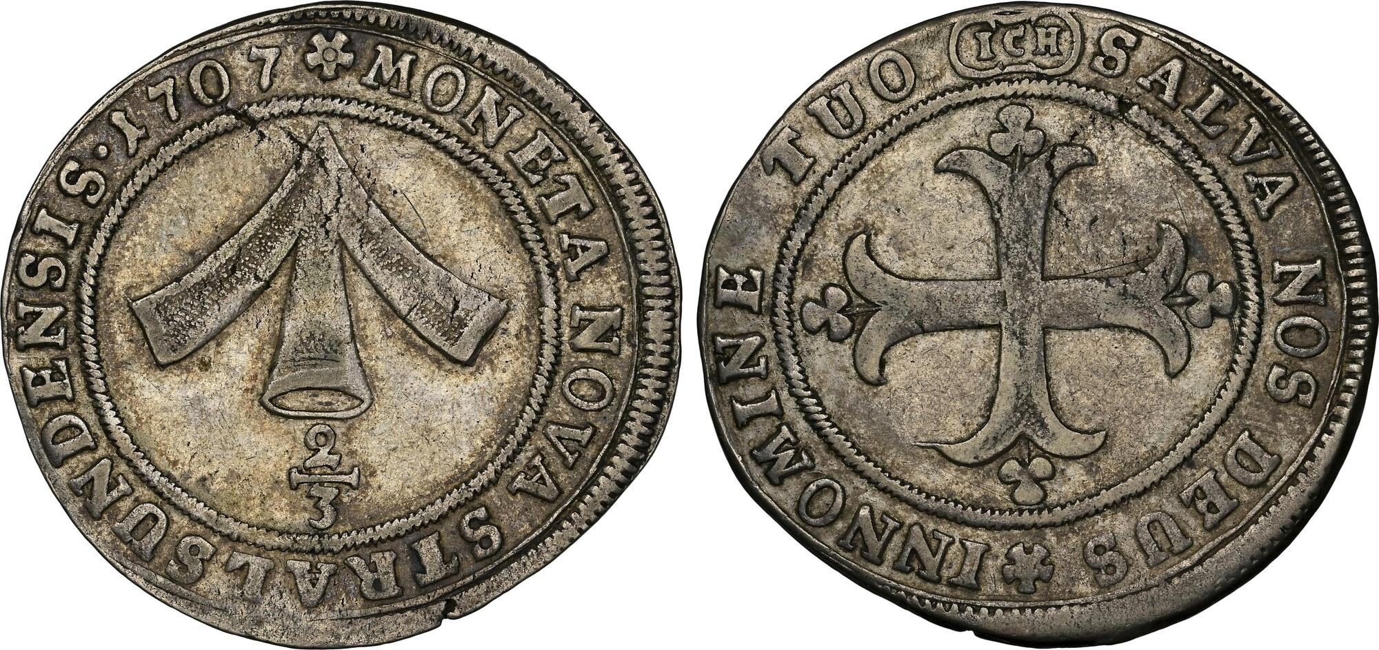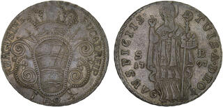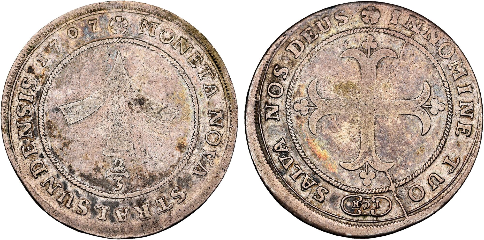 The Prussian city of Elbing (present day Poland) was under Swedish control 1626-1635 and again 1655-1660, and an extensive minting started in 1628. The City arms with the two crosses were intentionally made to resemble that of Danzig in order to facilitate the acceptance of the coinage in Poland.