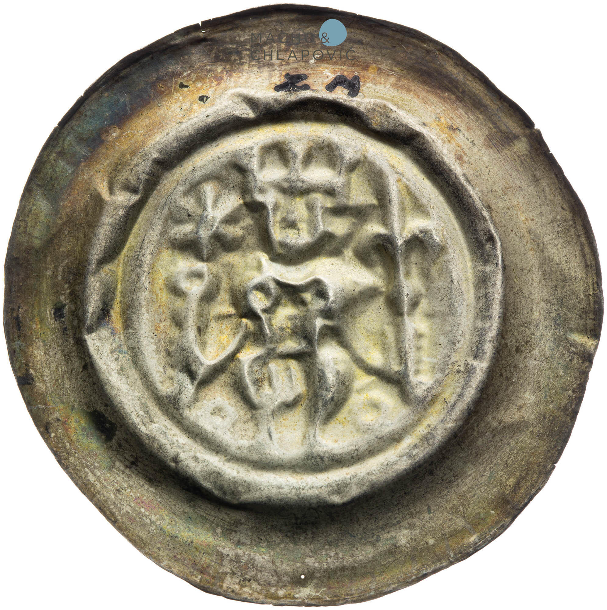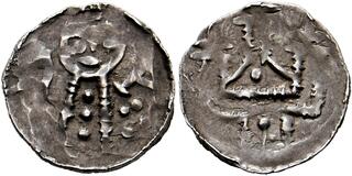 Pfennig (1,26g) Friesach Av.: geistliches Brustbild mit Krummstab in der Rechten, rechts ein großes A. Rv.: dreitürmiges Kirchengebäude, im Giebel und im Tor je ein Punkt. grobe Zeichnung R - CNA:Ca3 - s.sch.
