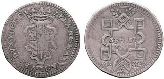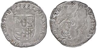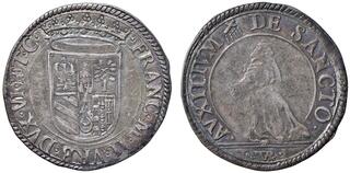 Italy. Urbino (Duchy). Francesco Maria II Della Rovere, 1574-1624. Half Scudo of 10 Grossi (Silver, 33.82 mm, 12.80 g). FRANC MARIA II VRB DVX VI ET C, Crowned coat-of-arms. Rev. GROSSI / X, Within ornate arched and angle frame; above, crossed oak branches with acorns; below, L - X. CNI XIII, 55. Cavicchi 181. Cabinet tone. Well struck, with usual areas of weakness. Good Extremely Fine. Very Rare.