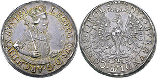 Erzherzog Leopold V. als Landesfürst. 1625-1632, Hall.Breite 3 Reichstaler 1626 (Stempel von Christof Amende). LEOPOLDVS § D § G . ARCHIDVX . AVSTRI Gekröntes und geharnischtes Hüftbild des Erzherzogs rechts mit geschultertem breitem Tulpenzepter, im Feld Jahrzahl. Rs: DVX § BVRGVNDI[AE] § COMES § TIROL Tiroler Adler mit schmalem Ehrenkranz. E. 223. M-T - (459b vgl). Dav. A3336. Schöne Patina. Kleine Randfehler und Kratzer. 85,49 g. R... | 7 May 2026 | Upcoming Auction | |