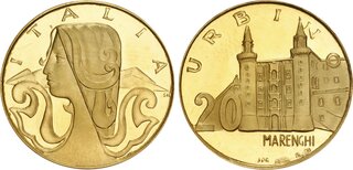 ITALY, Republic of Italy. 1946-Pres. Fantasy Proof Set. Urbino. Struck circa 1971. Includes: AR 2 Marenghi (.925 fine silver, 12.07 g) // AR 5 Marenghi (.925 fine silver, 30.32 g) // AV 20 Marenghi (.900 fine gold, 4.93 g). The silver richly toned. Proof. In original case of issue.
