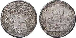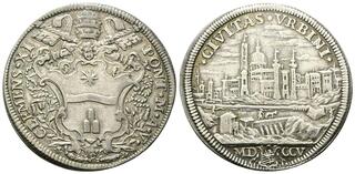 Dr. CLEMENS ✶XI - PONT✶ M✶ A ✶V✶. Stemma con testina di putto in cimasa sormontato da triregno e chiavi decussate; ai lati, E - H. Rv. ✶CIVITAS ✶VRBINI✶. Veduta di Urbino; in esergo, MD armetta D'Aste CCV.