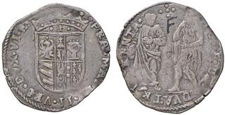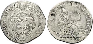 Roma. Testone anno VIII, AR 7,61 g. VRBAN VIII PONT M ANN VIII Busto a d., con piviale ornato da figura della B. Vergine. Rv. AVCTA AD METAVRV DITIONE Roma, galeata ed in abito militare, seduta a d., con spada nella d. e Basilica di S. Pietro nella s.; a d., in basso, armette Bonanni, Pagliari e Martelli e, all'esergo, ROMAE. Muntoni 44. Berman 1714. MIR 1706/1.