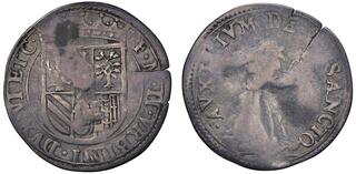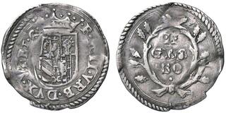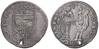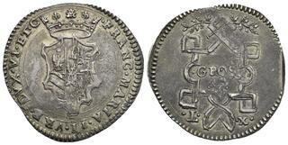 Da 30 quattrini, AR 2,85 g. FRA MARIA II VRB DVX VI E Stemma semiovale coronato. Rv. MONE DA QVATRI – TREN – TA Scena dell'Annunciazione. CNI 89. Cavicchi 196.