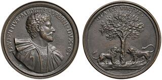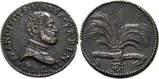 Bronzegussmedaille (6,58g), (28mm) nach dem Original eines unbekannten Künstlers um 1521. Auf die Wiedereisetzung von Francesco Maria als Herzog von Urbino und Herr von Pesaro; Papst Leo X. setzte ihn ab, da er das Herzogtum für die Medicis haben wollte. Rv.: Palme, Symbol für Willensstärke; ein Baum der sich biegt, aber nicht bricht. (Die Originalmedaille ist selten). ; ; s.sch.
