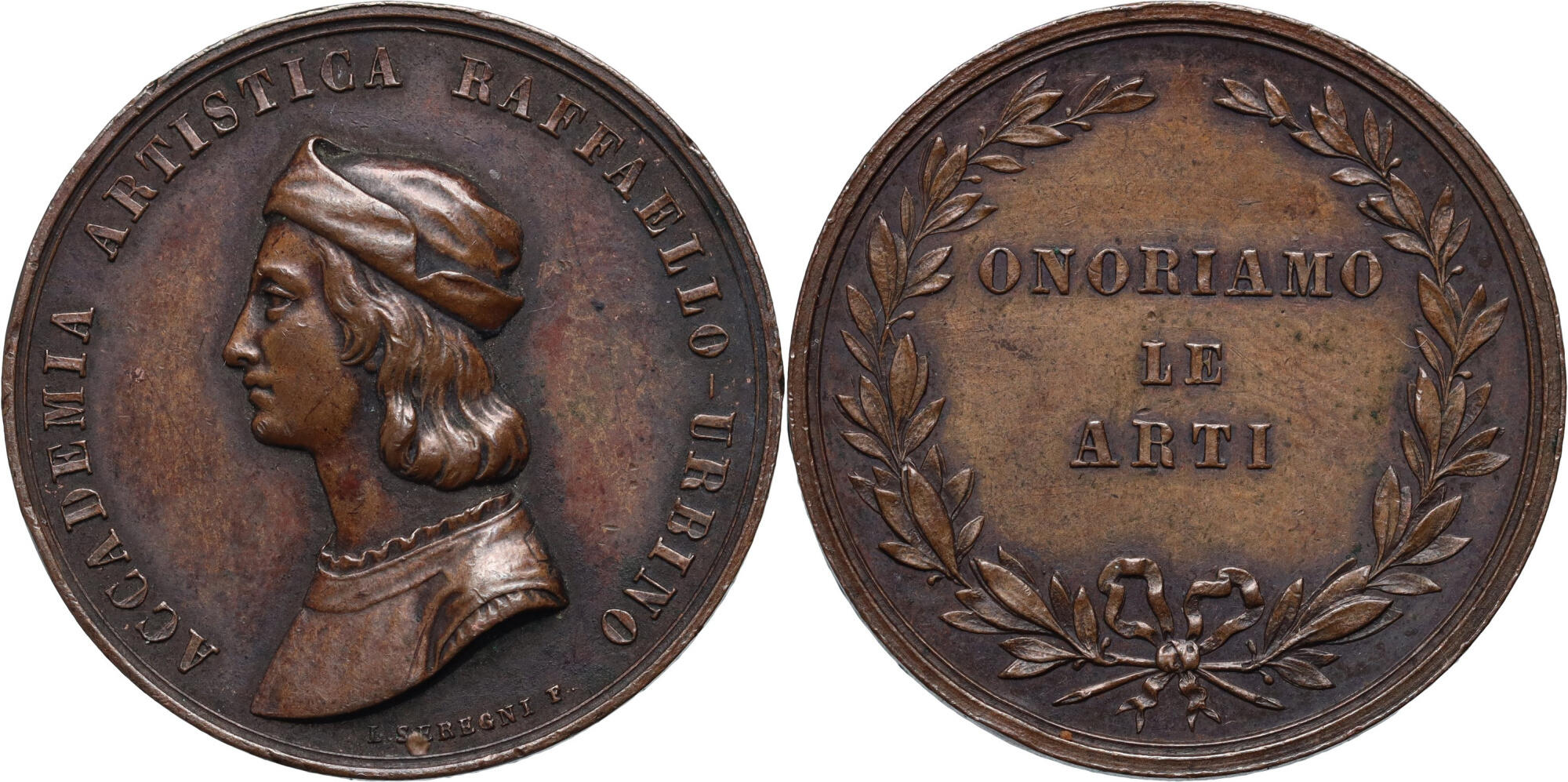 PERSONAGGI - Raffaello Sanzio (1483-1520) - Medaglia 1872 Urbino Premio Accademia Ø: 28 mm. (AE g. 12,1). SPL-FDC