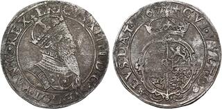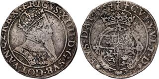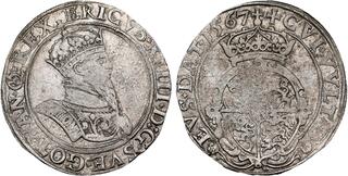 Sweden - 16 Öre 1567, Silver, ERIK XIV 1560–1568 Stockholm mint. Crowned shield, ER inside, dividing denomination. Rev. Crowned shield, three crowns inside, dividing date.SM 48; Delz. 71 (R).23.73 g. Better date. Cleaned. 1+/01)(1+. Nearly extremely fine