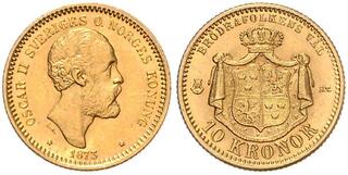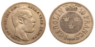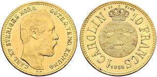 Carolin / 10 Francs 1868, Stockholm. Die Kronen im Wappen mit Schraffur. Mit der Signatur LA (Lea Ahlborn, Stempelschneiderin in Stockholm). 3.22 g. Delzanno 25. AAH 10. Fr. 92. Fast vorzüglich / About Extremely Fine.