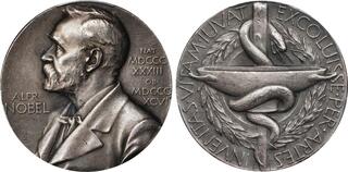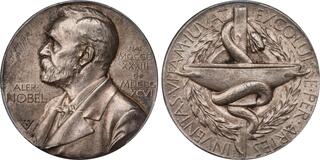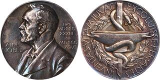 Ehrensvard-22; Lagerqvist-3A. By E. Lindberg. Diameter: 26mm. Obverse: Bust of Nobel facing left; Reverse: Basin and serpent-entwined staff of Asclepius with wreath behind. Edge: MJV SILVER 1960.