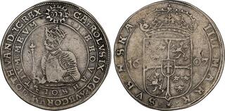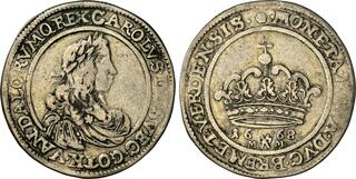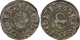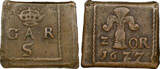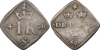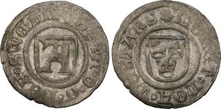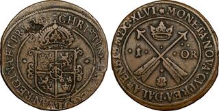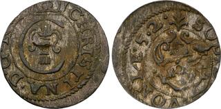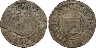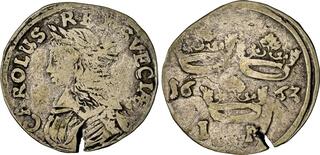 The Prussian city of Elbing (present day Poland) was under Swedish control 1626-1635 and again 1655-1660, and an extensive minting started in 1628. The City arms with the two crosses were intentionally made to resemble that of Danzig in order to facilitate the acceptance of the coinage in Poland.