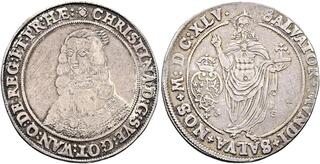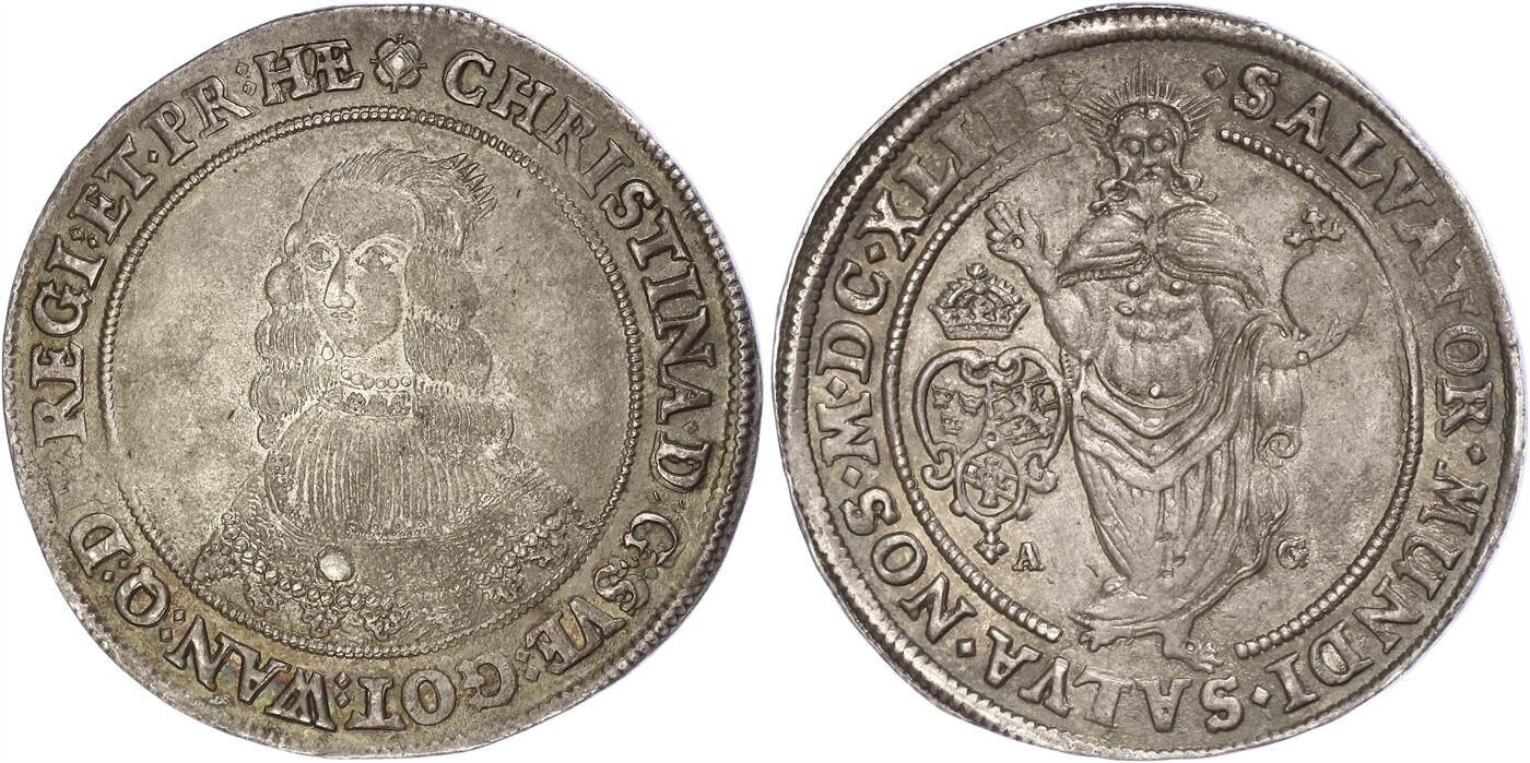 Riksdaler 1645, Stockholm. Münzmeister Antony Grott (Grooth) d. J. 28.48 g. Delzanno 26. AAH 17. Dav. 4525. Selten / Rare. Gereinigt / Cleaned. Portrait bearbeitet / Portrait tooled. Sehr schön / Very Fine.