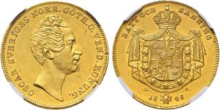 Sweden - 4 Ducats 1846 AG, Gold, OSCAR I 1844–1859 Stockholm mint. Bare head right. Rev. crowned arms, divided date below.Fr. 88; SM 1; SG 1 (R).RR. NGC MS61