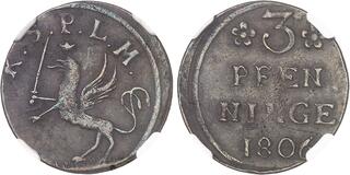 Poméranie, Gustave IV Adolphe (1792-1809). 3 pfenninge, 1er type (légende courte) 1806. NGC AU 58 BN (6865574-003).
