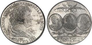 Av. CAROL: XII D. G. SVEC. GOTH. VAND. REX PROPUGNATOR FIDEI. Buste cuirassé et drapé à droite, avec signature JM ; au-dessous, en écriture manuscrite : "1 Reichs Thler : nach alten schr: u: korn:".