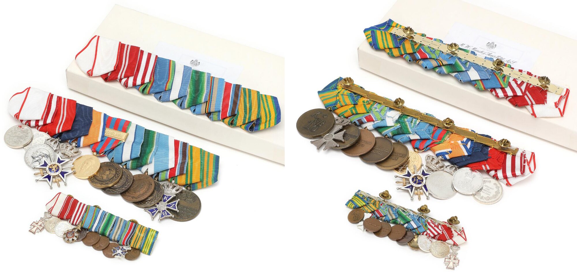Bar with various medals from Denmark, France, Holland and Sweden as well as an almost corresponding miniature bar