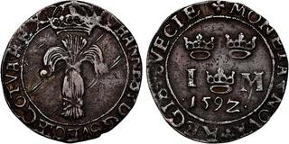 Sweden - 1 Mark 1592, Silver, JOHAN III 1568–1592 Stockholm mint. Crowned Vasa sheaf. Rev. Three crowns dividing denomination, date below.SM 63b; Delz. 52.6.64 g. Lines from upper right to down left. 1/1+)(1+. Nearly extremely fine