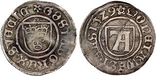 Sweden - Örtug 1529, Silver, GUSTAF VASA 1521–1560 Västerås mint. A inside shield surrounded by three dots. Shield of three crowns surrounded by three dots.SM 18a (R); Delz. 231 var. Falkensson listar 5 kända exemplar på privat hand av detta mynt. // Falkensson lists 5 specimens in private hands of this coin. 1.45 g. Full date ´1529´. RR. Variety with three small rings surrounding both shields. Planchet crack. For the type an attractive specimen. 1/1+. Almost very fine