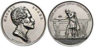 Von Pehr Lundgren. Auf den Tod des schwedischen Staatsmannes und Militäroffiziers Graf Nils Magnus Brahe. Av.: MAGNUS BRAHE, drapierte Büste nach rechts, signiert PEHR LUNDGREN F. Rv.: STETIT AD FINEM LONGA TENAXQUE FIDES, trauernder Mann am Sarkophag stehend, im Abschnitt: CIVES ET AMICI / MDCCCXLIV. Dm: 56 mm. Gew.: 85,07 g. Selten! Kl. Kratzer stempelfrisch