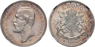 Sweden - 2 Kronor 1897, Silver, OSCAR II 1872–1907 Stockholm mint. Head left. Rev. crowned arms with supporters.SM 53; Delz. 19.NGC PF65 Cameo 01/0, Spegel.