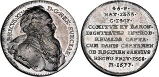 HISTORIEPENNIGEN - HISTORICAL MEDALS - MEDAL - HEDLINGER'S REGNAL LIST - ERIK XIV , ERIK XIV 1560–1568, Sweden Bust right. Rev. Text on ten rows.SKM 47d.SN - 34 mm. 11.40 g. 01/0. UNC