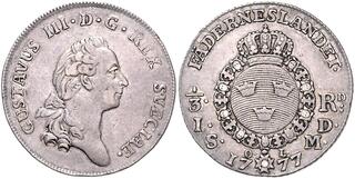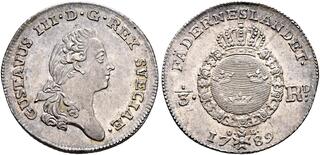 1/3 Riksdaler 1789, Stockholm. Münzmeister Olof Lidijn. 9.77 g. Delzanno 58. AAH 73. Sehr selten in dieser Erhaltung / Very rare in this condition. Fast FDC / About Mint State.