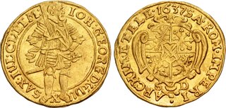 GERMANY, Sachsen (Duchy & Electorate [Albertine line]). Johann Georg I. Elector, 1611-1656. AV Dukat (23mm, 3.47 g, 5h). Dresden mint. Dated 1637 SD. Armored figure of Johann Georg standing right, holding sword over shoulder / Coat-of-arms. Clauss & Kahnt 117; KM 390; Friedberg 2684. In NGC encapsulation 8419875-008, graded MS 60. Top Pop.