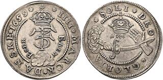Krone (4 Mark) 1659, Kopenhagen. "Eben Ezer". Geprägt auf die Vereitelung der Eroberung Kopenhagens durch die Schweden am 11. Februar. Münzmeister Henrik Köhler. 21.99 g. Hede 100A. Sieg 53.1. Dav. 3576. Feine Patina / Nicely toned. Vorzüglich / Extremely Fine.
