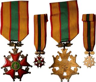 IRAN, Pahlavis. Muhammad Reza Shah, AH 1320-1358 / AD 1941-1979. Order of Service (Khidmat) (Gilt Silver and Enamel, 45 mm, 25.00 g), Set of two Orders, 2nd Class and Miniature. By S & Co, Sweden, after 1947. Medaillon with Pahlavi Crown in green enameled center, set on red enameled five-armed cross and wreath. Rev. 925 S / MADE IN SWEDEN / S&Co. Rare. Both on original red, yellow and green striped ribbons. Good extremely fine.
