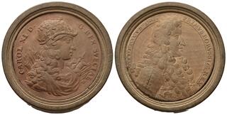 Karl XI., 1660-1697 Brettstein aus hellem Ahornholz o. J. Büste in Antiker Rüstung nach rechts. Rv. Friedrich I. von Preußen nach rechts. Eingesetzte Inlays? 55.1 mm. Himmelheber . 21.10 g. Sehr schön-vorzüglich / Very fine-Extremely fine.