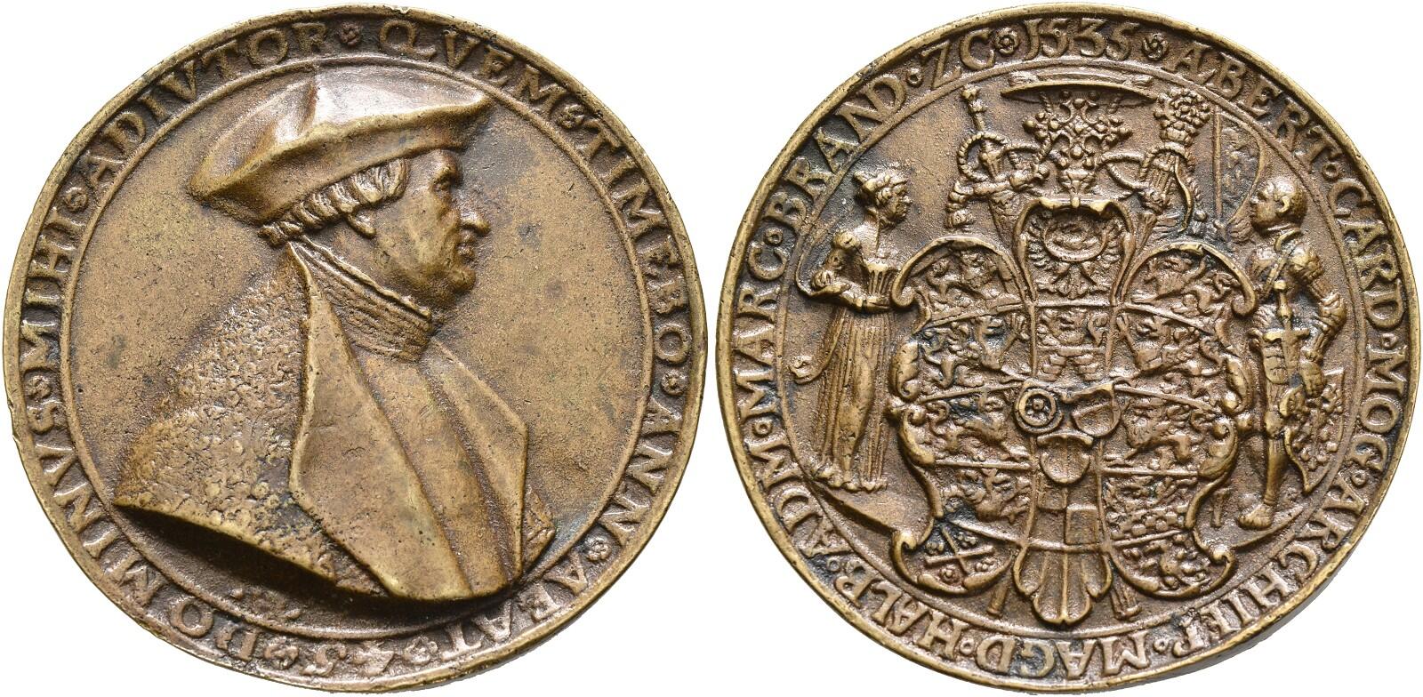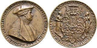 German States: Saxony. Silver Cast Medal, 1535. Kress-605; Domanig 154; Scher-126; Habich-1935. 62.2 mm. 53.74 grams. By Hans Reinhart the Elder. Johann Friedrich, 'the Magnanimous', 1503-54. Obv.: IOANNIS. FRIDERICVS. ELECTOR. DVX SAXONIE. FIERI. FECIT. ETATIS SVÆ. 32nd Year of his Age; facing three-quarter length figure of the Elector, holding sword over his right shoulder and shield surmounted by electoral cap. Reverse; SPES MEA IN DEO EST ANNO NOSTRI SALVATORI M. D. X. X. X. V [My Hope is ...