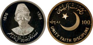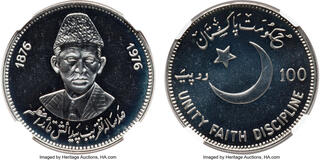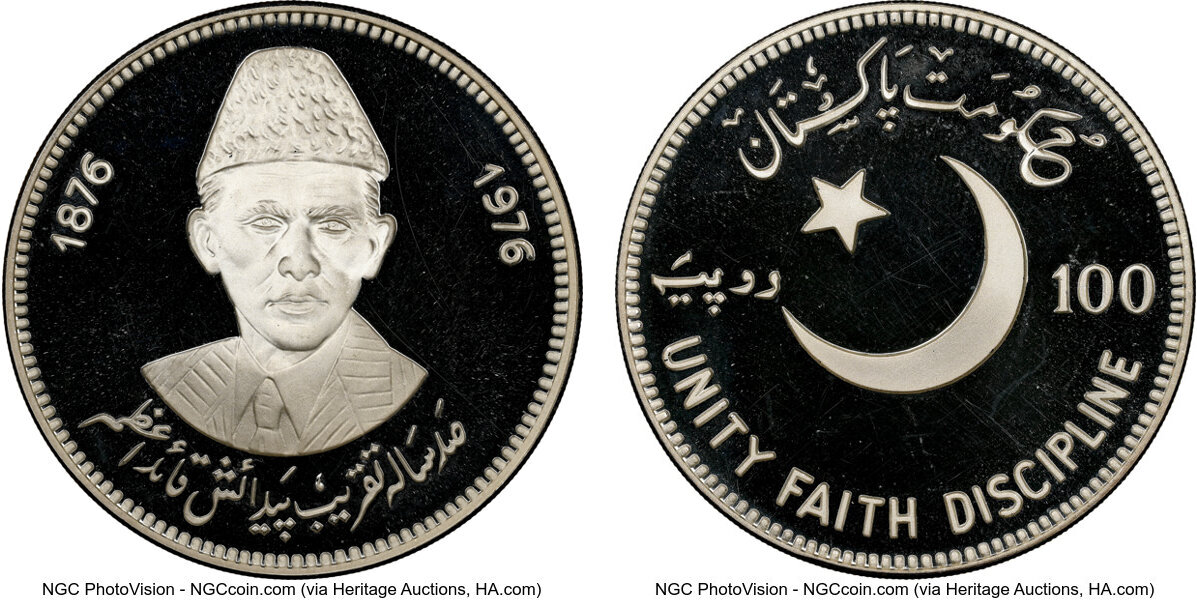Republic silver Proof "Birth of Mohammad Ali Jinnah - 100th Anniversary" 100 Rupees 1976 PR66 Ultra Cameo NGC, KM41. Mintage: 1,300. Commemorating the birth of the founder of Pakistan, Mohammad Ali Jinnah, who was born on December 25th, 1876. www.HA.com/TexasAuctioneerLicenseNotice