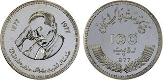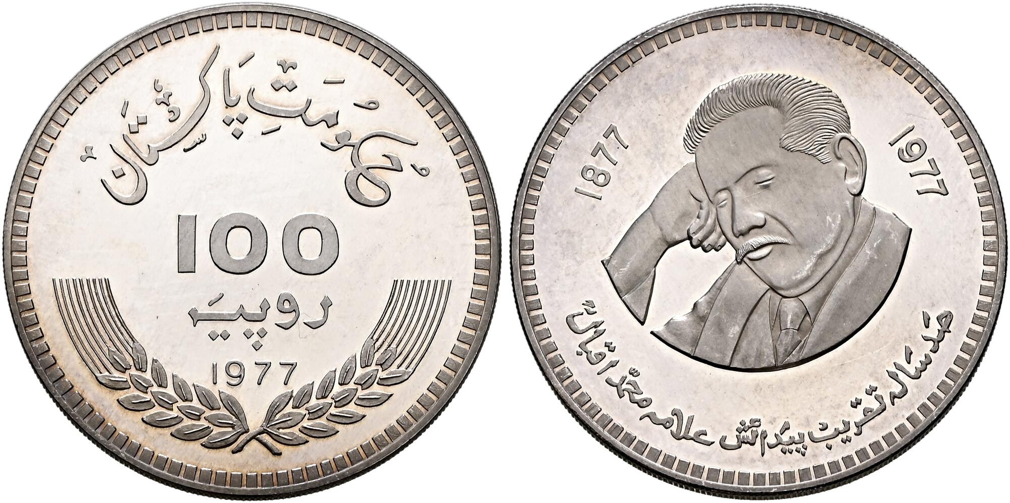 PAKISTAN: Islamic Republic, AR 100 rupees, 1977, KM-48, 100th Anniversary of the Birth of Allama Mohammad Iqbal, a few hairlines and tiny obverse spots, prooflike, mintage of only 3,000 pieces, scarce, Unc, ex Dr. Wolfgang Schuster Collection.