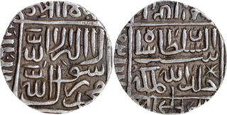 Delhi Sultanate, Suri Dynasty, Sher Shah (AH 945-952 /1538-1545 AD), Shergarh Bakkar urf Shiqq Bakkar Mint (by style), Silver ½ Rupee, Obv: Arabic legend The Kalima Shahada within a square, the four Caliph's names in the margin, Rev: Arabic legend "Sher Shah Sultan khuld Allahu mulkahu", with star mint mark Nagari legend 'Sri Ser Sah' within a square, "Farid ud-dunya wa'l din Abu'l Muzaffar" at the margin "zarb Shergarh Bakkar" off flan at the bottom margin, 5.71g, 22.22mm, (GG # D 805) no... | 7 Nov 2025 | 170,000 INR | |