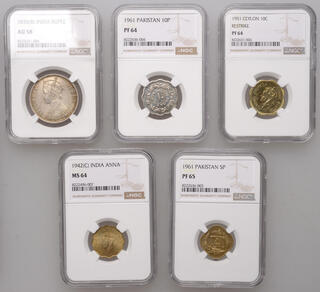 REPUBLIK Proof Set in Silber, bestehend aus 100 Rupien o. J. (1976, 100. Geburtstag Mohammad Ali Jinnah); 100 Rupien 1977 (Minarett); 100 Rupien 1977 (100. Jahrestag – Geburt von Allama Mohammad Iqbal). In US-Plastikholdern der NGC mit den Bewertungen MS 66 DPL, MS 67 DPL und MS 69 DPL (6694840-001-003). K./M. 41, 47, 48.